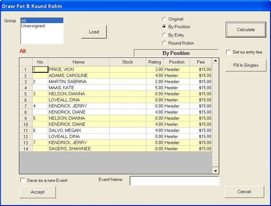 For Team Roping click the By Position selector, and then click the Calculate button., the program will process the entries, keeping the “Pick “ entries together, and combining the “Draw” entries