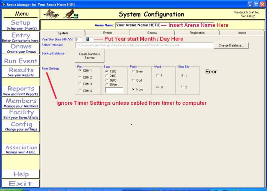 Arena Manager Manual Setting Up Your Arena Manager 1. Open the Config screen first. a. On the System tab, enter the beginning year (month/year, i.e, 10 5 for October 2005). Note Database: Use this screen to “Create Database Backup” and do this frequently during a show.