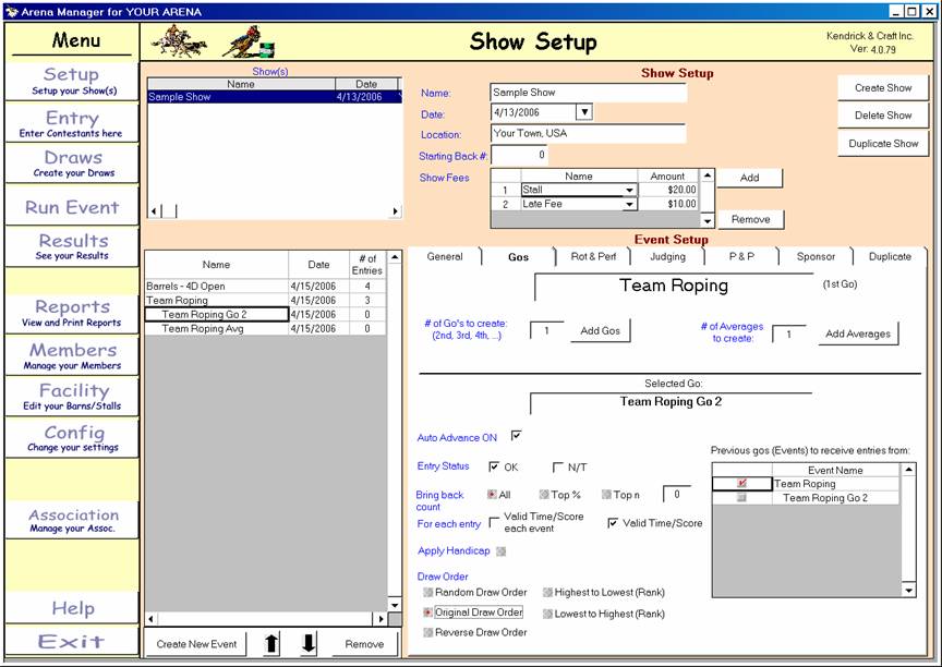 First insert the number of go’s / head you need a 3 header, would require 2 extra go’s, a 2 header , would require 1 “extra go” , then click the “Add Go’s “ button , you will see your event on the list to the left get extra rows label with Go 2 , …… and so on. The add 1 in the # of averages to create box, and click the “Add Averages “ button , and a “Event Name “Average” will appear in the list on the left.
